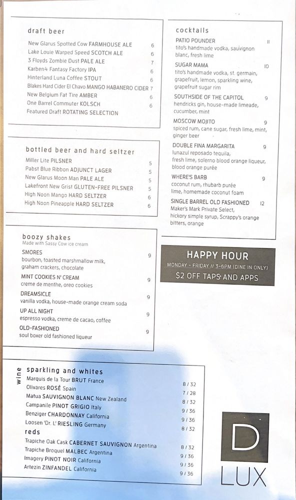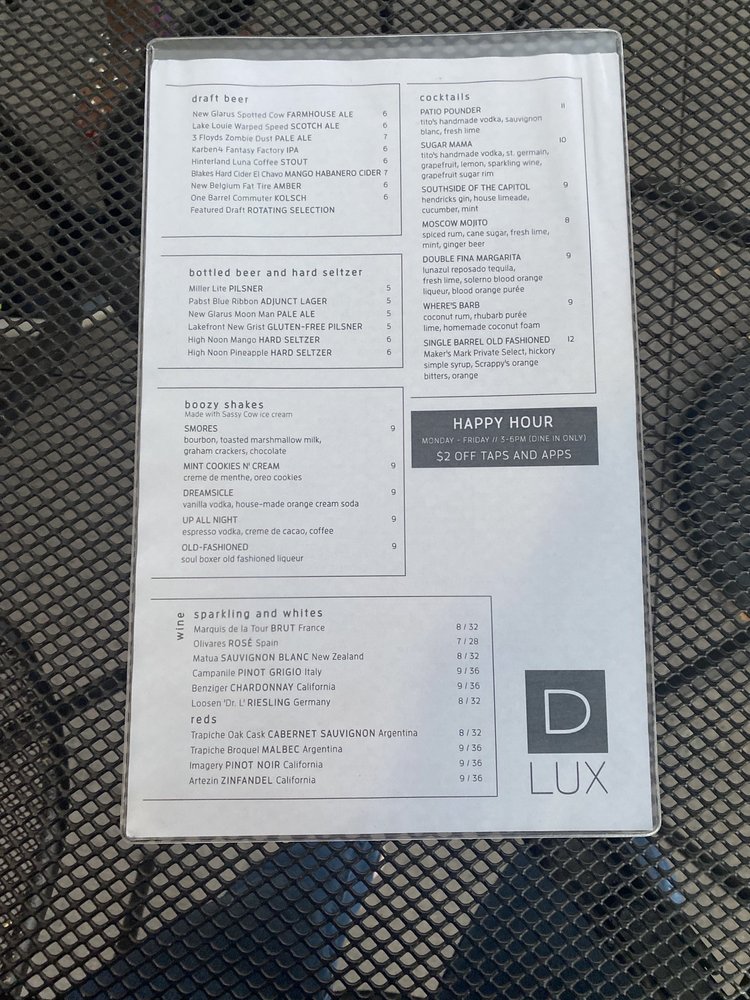 Introducing DLUX, a trendy cocktail bar in Madison, WI. Offering a diverse menu of breakfast, brunch, and burgers, DLUX caters to various dietary preferences with vegan and vegetarian options. The restaurant boasts a range of amenities, including outdoor seating, free Wi-Fi, and happy hour specials. Customers rave about the Parmesan truffle fries, OG burger, and cheese curds. The vibrant atmosphere and attentive service make dining at DLUX a memorable experience. Don't miss out on trying their boozy milkshakes and signature Bloody Mary. Whether you're looking for a casual brunch or a lively dinner spot, DLUX has something for everyone. Experience the delicious flavors and vibrant ambiance of DLUX for yourself at 117 Martin Luther King Jr Blvd.
